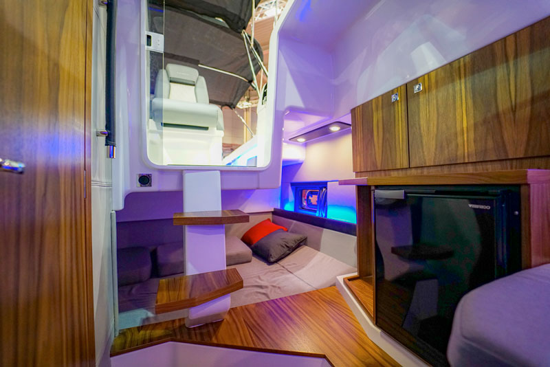 À 3 500 tr/min, le bateau navigue à plus de 20 nœuds avec une consommation de carburant de seulement 44 l/h, ce qui signifie qu’à un peu plus de 2 l/nm, vous pouvez parcourir beaucoup de miles avec une très faible quantité de carburant.