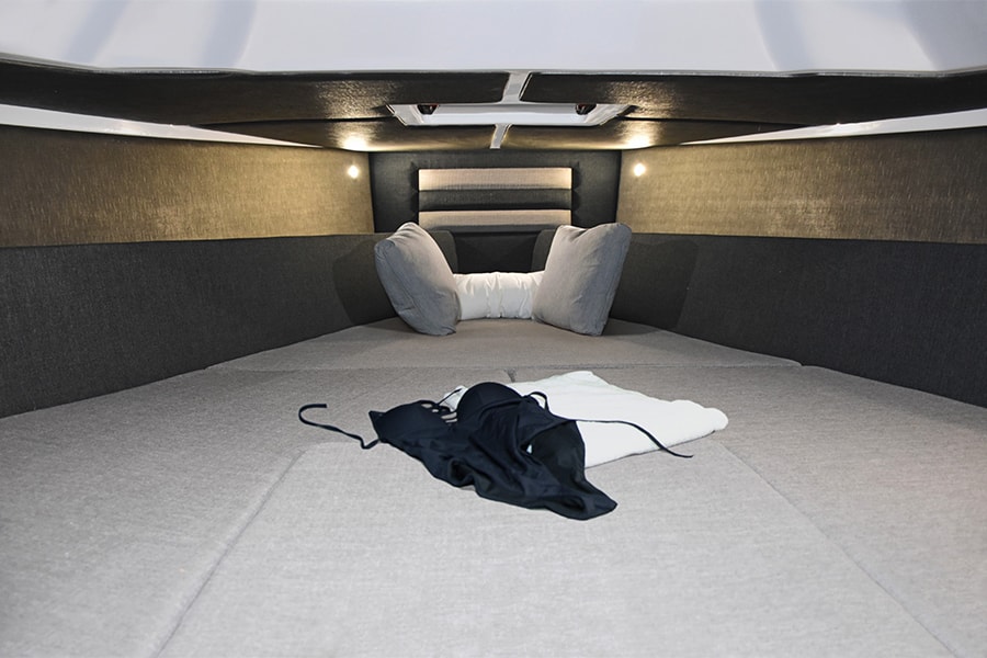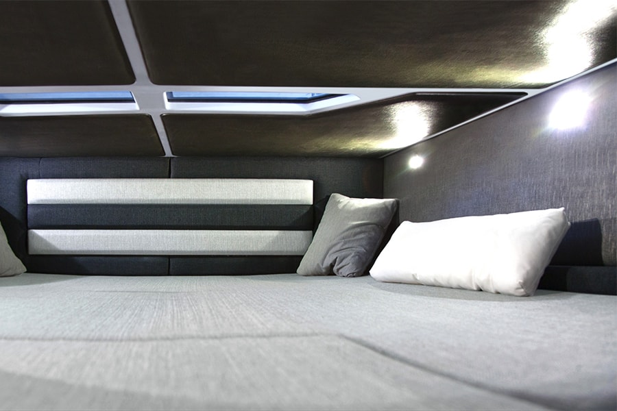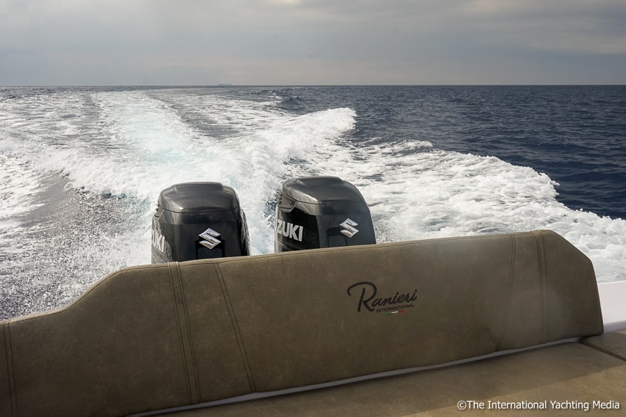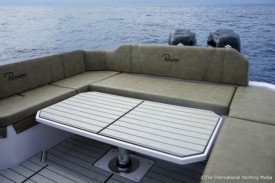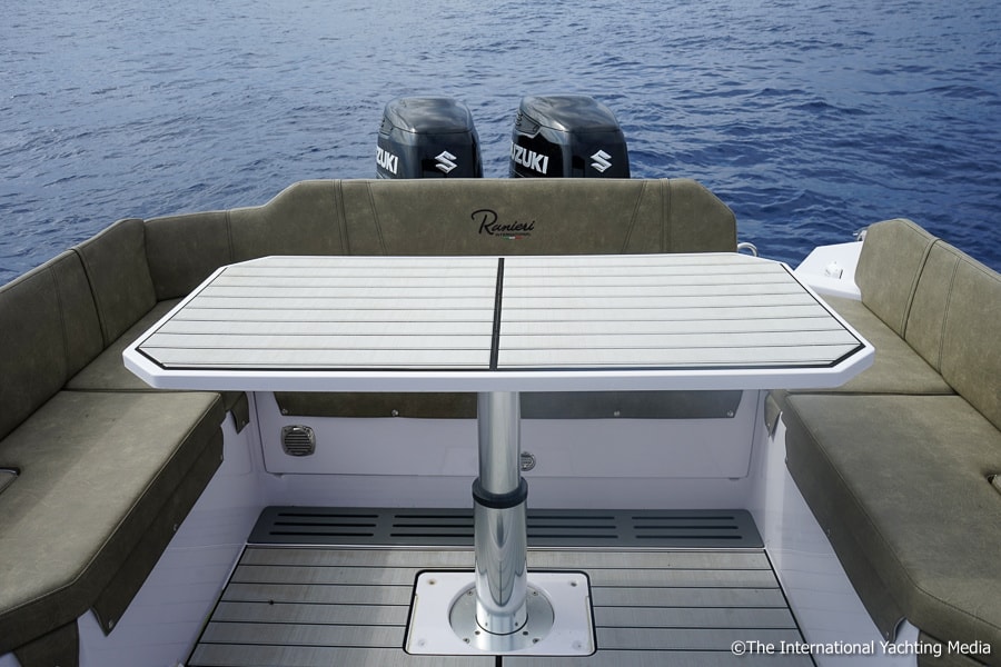 Ranieri International has managed to obtain two double cabins: a V-shaped one in the bow and another in the stern, below the cockpit. The latter is flooded with natural light by a large window.