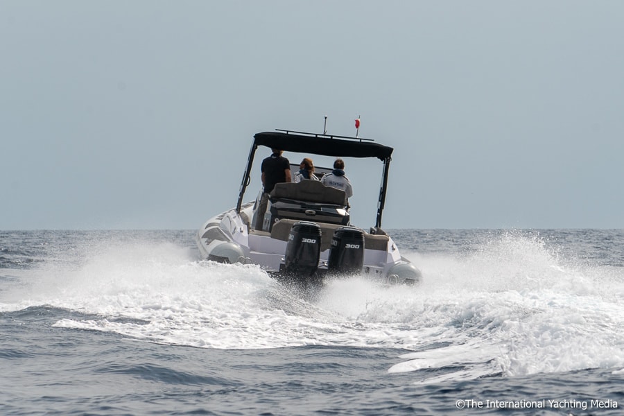 An extraordinary cruising attitude for a complete maxi RIB that has much to offer: abundant spaces both inside and outside, a high comfort level under way and exciting steering. The lovers of speed will certainly opt for a more powerful engine package for extra fun and even more exciting performance at sea.