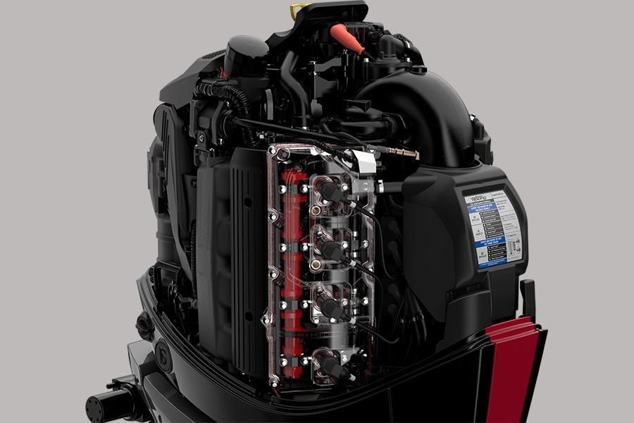 Cold Fusion White models are finished with Devil Red Eye cowl accent panels with a white Advanced MidSection (AMS) and gearcase. Black models are finished with Graphite Grey cowl accent panels and matching Graphite Grey AMS and gearcase. Devil Red Eye, Graphite Grey and Carbon Fiber accent panel kits are available to custom-match a 450R outboard to a boat color scheme.
