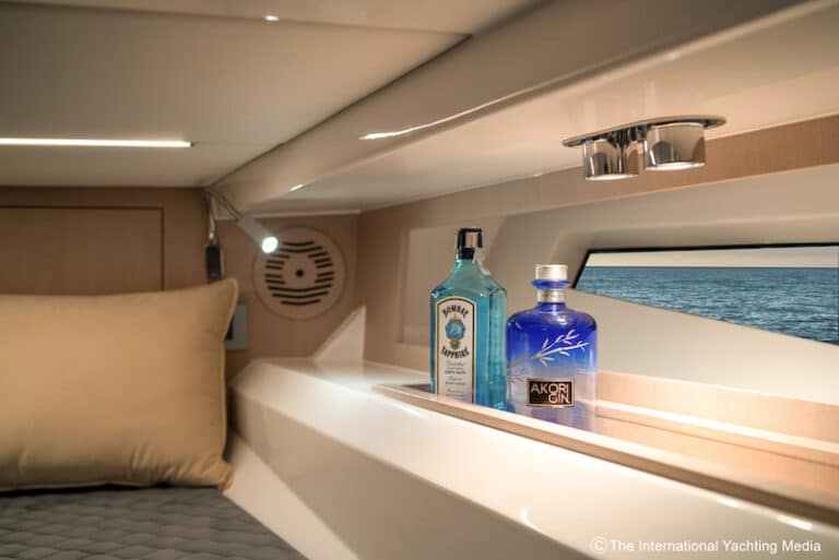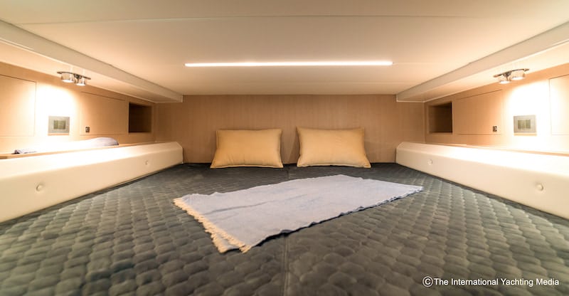 The whole bow area, furnished as a living room with a single-legged aluminium table, can be quickly converted into a large double bed; this space features a good headroom and is made bright by the presence of a fixed glass window on the ceiling and a large opening hatch (the same that houses the above-mentioned couch) which significantly amplifies liveability. The white glossy counter print and light laminate furniture make the interiors fresh and bright.