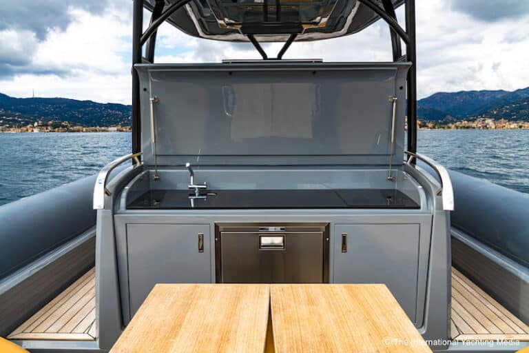 The quarters house two mobile fiberglass covers that partially hide an electric winch and a cleat on each side: aesthetically pleasing, this solution is also convenient during mooring maneuvers and comfortable as a seat. On the sides, between the sofa area and the stern section, the long hanrails enhance the feeling of safety offered by this inflatable boat.