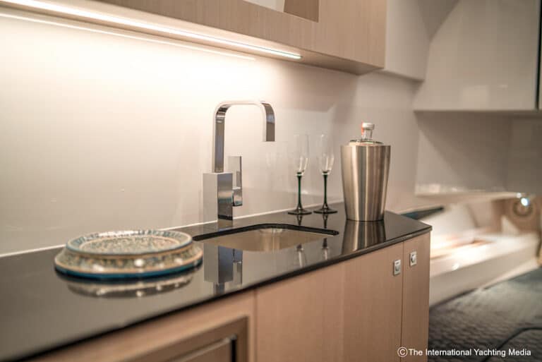 The deck is entirely made of standard solid teak, stern platforms included, while the side courtesy lights generate an elegant and comfortable atmosphere at night. At mid-ship and behind the helm station, hidden underneath a heavy lid, there is a wet bar equipped with a 100-liter refrigerator, an additional 75-liter fridge, a cabinet, a sink and an induction plate.