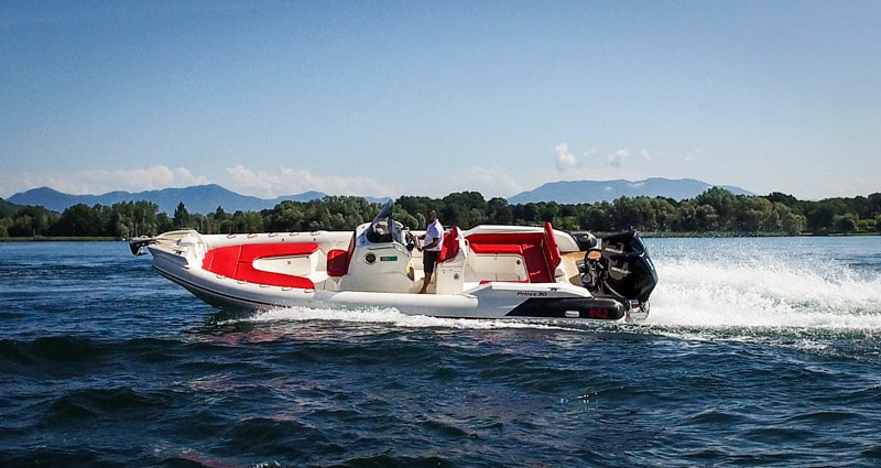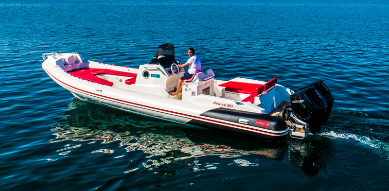 I put the electronic throttles in single-lever mode and I push them down. The two Mercury engines evolve from a silent mumbling to an exciting sound that, if it was the title of a song, it would certainly be “Losing my religion” because the acceleration of the Prince 30 has no parallel in any other boat tested until now.