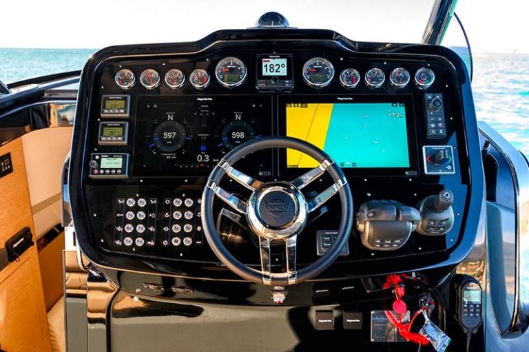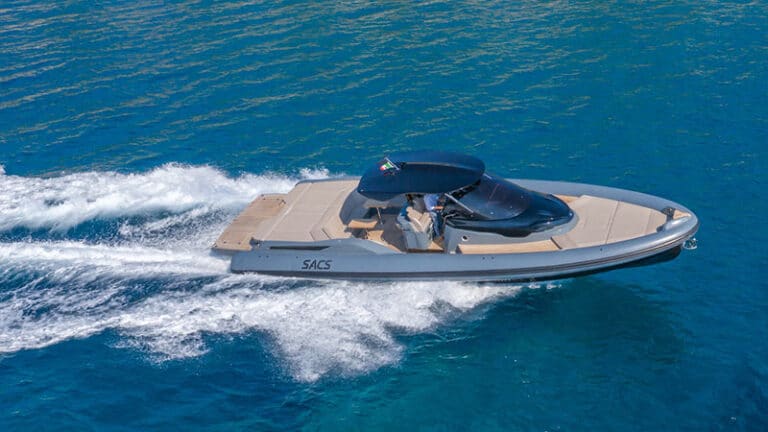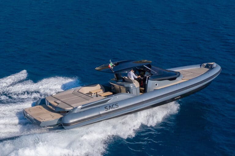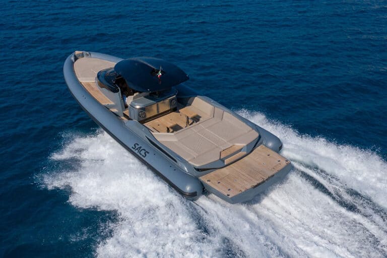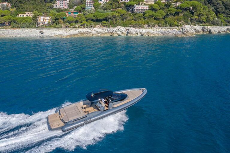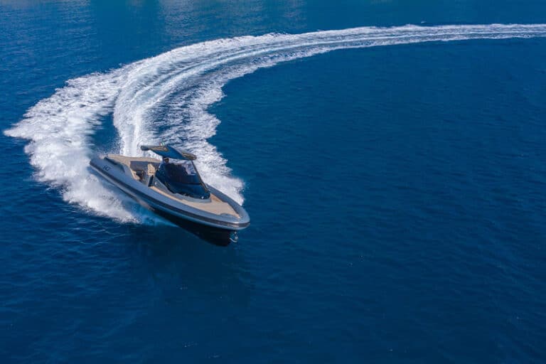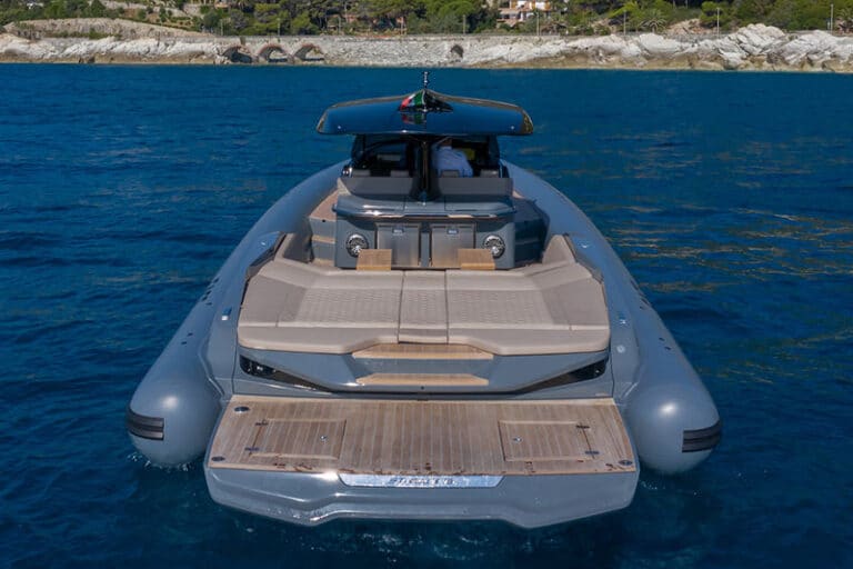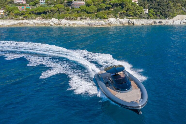 Now, it’s time to push the throttles all forward: the tubes do not vibrate, the boat maintains a compact pace and the cockpit is perfectly dry. In short, comfort goes hand in hand with performance. At 3,700 rpm, the boat runs at 40.7 knots. A really stunning top speed for a sterndrive RIB of this size.