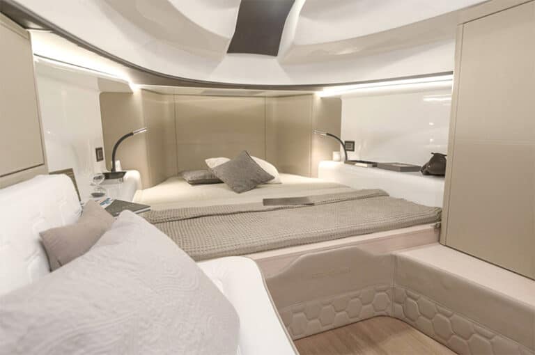 In this abundant boat section, where the stern platform is mixed with a large sundeck that can be protected by a bimini top supported by two carbon poles, passengers have the feeling of shamelessly relaxing in a beach cabana of a five-star resort.