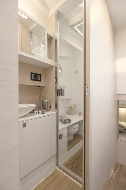 Two king-sized beds (one on the bow, the other under the cockpit behind the access ladder) and a head with separate shower make the cabin a real modern, elegant and extremely comfortable suite.