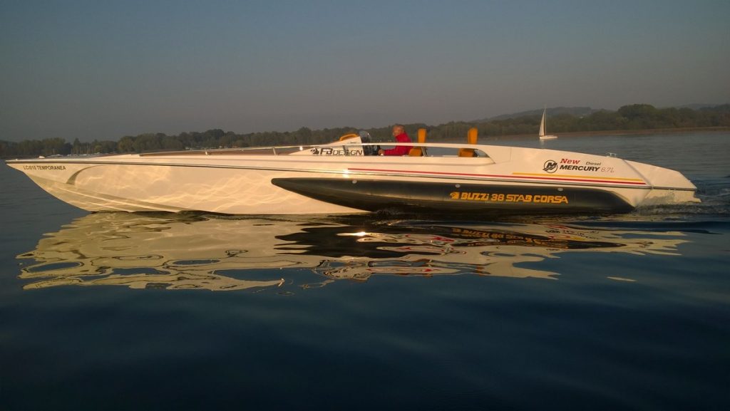 While the first time we had climbed on board the Buzzi racer – at 2017 Genoa International Boat Show – the sea was choppy with 15 cm waves, during the Mercury Days, the surface of Lake Maggiore was smoother than the Autocamionale della Cisa road surface. As you know, such perfect conditions are not good to test the genuine performance a boat. However, it was a perfect occasion for us to shoot this missile at its maximum speed.