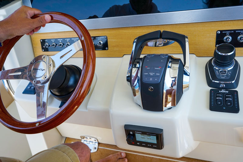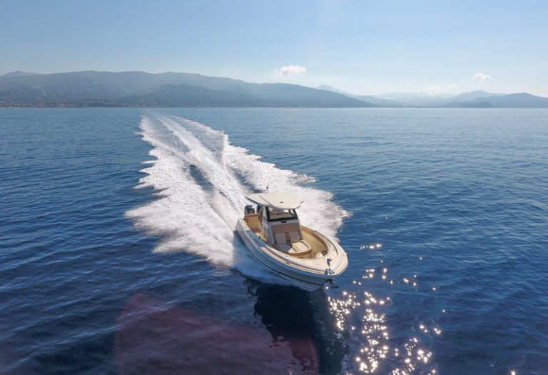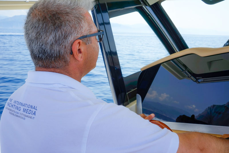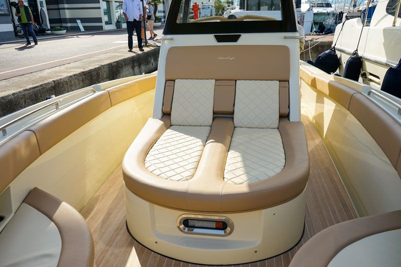 To go out of the narrow berth is a piece of cake and, as soon as we are out of the port, we sail at displacement speed while benefiting from an uncommon stability for a boat of just 30 feet. I reach the center console, equipped with two pilot chairs ( to call them “seats” would be an understatement”) which can be used both in a seated and a standing position thanks to a convenient lumbar support.