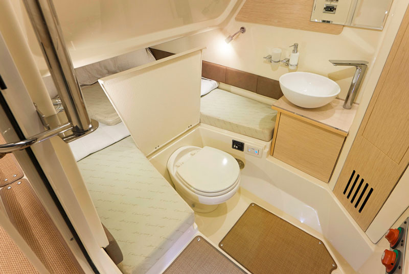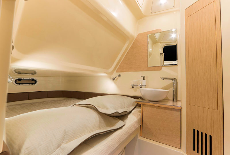 Then, I open a large hatch to place my equipment and … I am stunned, since, just in front of me, a real fully-equipped cabin opens up, furnished with a double bed of unexpected size. This center console also houses a real pilot house, which elevates this boat to the status of a vessel perfect for short- or medium-range navigation.