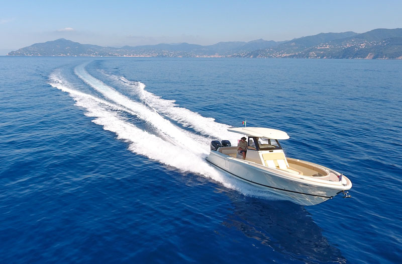 I speed up again and, at 5,000 rpm and 40 knots, the boat is so stable that it feels like we’re driving on the road. With throttles all down, we reach 46 knots, I trim at best and top speed rises to 48.3 knots.