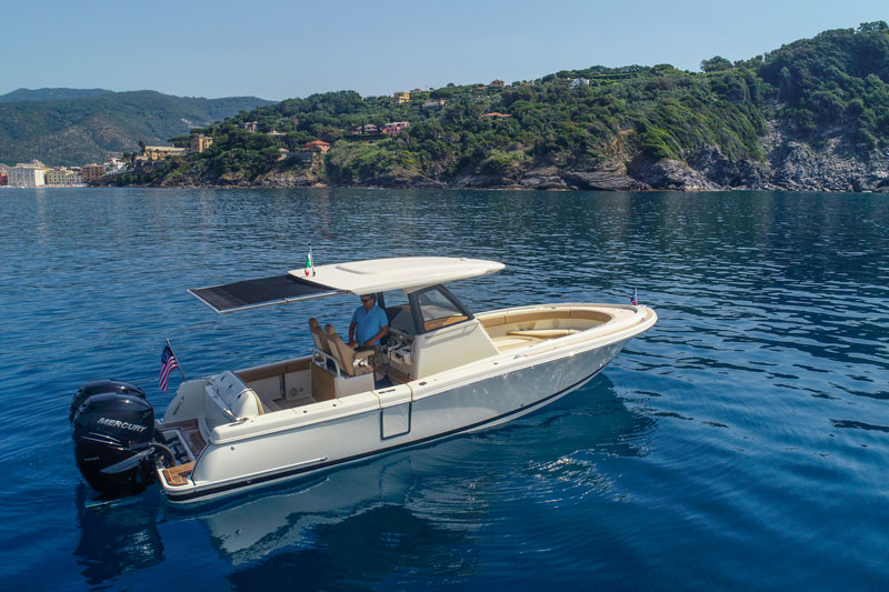 On board, we have the best of Mercury electronics: a joystick, an Active Trim system and electronic throttles. The stern is home to twin Verado 350hp outboards; displays haven’t been installed yet and will be chosen by the lucky owner of this beautiful creature that is tested in the Italian waters for the first time.