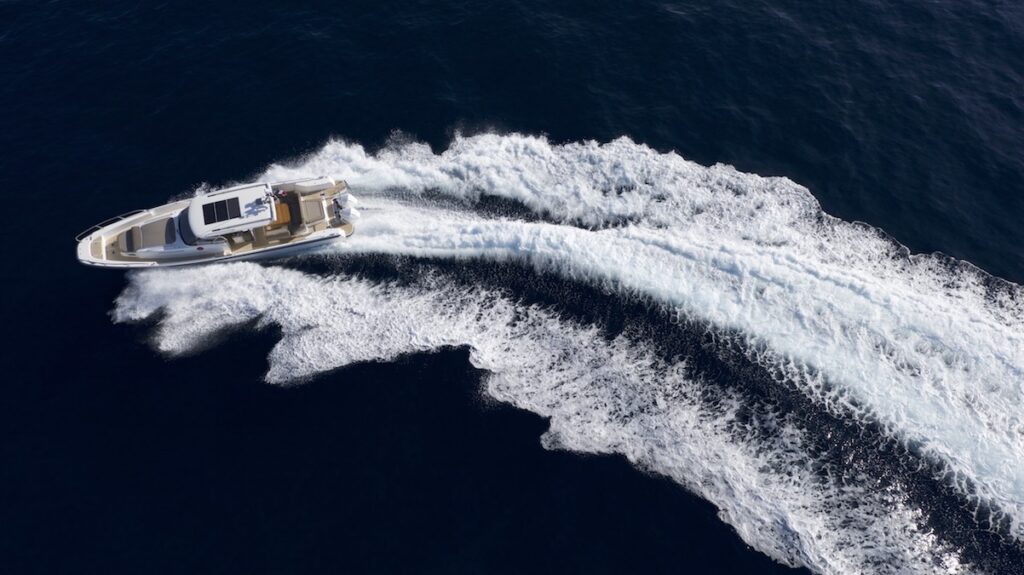 Wanting to test the directionality of the Nimbus T11, I speed up to 30 knots and try a couple of properly closed turns, then draw a nice circle from about 65 feet. Nothing: the T11 always shows great tenacity, is really stable. I try to reach top speed, not caring about the rough sea. For a moment I reach almost 38 knots. Considering that there are four of us on board (that’s five and a half men in terms of build) and the unpleasant sea and weather conditions, this is really great performance. Not to mention the fuel consumption, which, according to the data on the dashboard, is always just over 3 liters per nautical mile, which is unique.