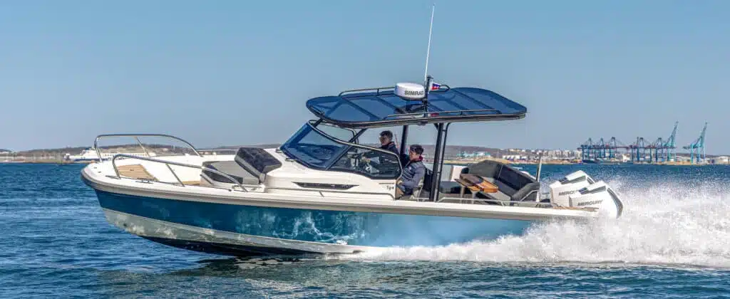 On this version, the T-Top provides perfect protection from the sun thanks to the reflective material that lets light through while creating a very useful heat barrier on hot days. Equally interesting is the possibility of closing the entire central dinette thanks to the hinges at the ends of the large T-top, which connect with the windscreen and also enable the winter use of this boat, which cleverly provides complete protection from wind and weather. The helm console offers plenty of space, even for taller people such as Niclas Augustin, manager and technician of the yard, who will be testing the boat with us today.