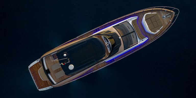 A contiguous series of “fluorescent-psychedelic” blue courtesy lights run along the side-decks and the bow sofa, giving a very glamorous effect at sunset.