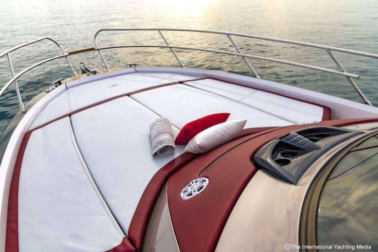 The wide cushions are made of the same two-tone marine fabric of the helm station upholstery. The bow section houses a windlass locker, the warping end and a convenient gangway for easy access to the quay (for this purpose, the rail is lowered to the sides in correspondence with the floor).