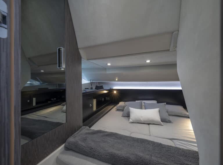 This area occupies what, on inboard or sterndrive boats, is the engine room: in this case, outboard propulsion has allowed to fully exploit the interiro volumes. On the sides, there are two bedside storage units. A mirror placed on the wardrobe plays with volumes, amplifying the dimensions, while the side windows brighten the environment.