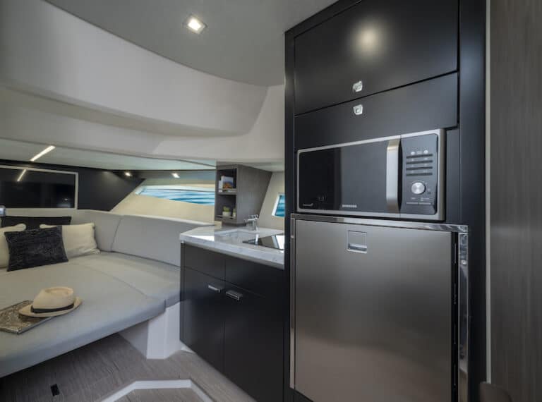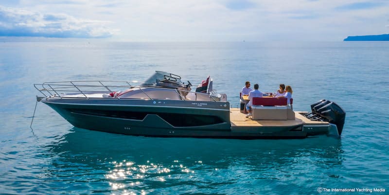 When the sides are open, the lounge with its rectangular dining table remains in the middle of a completely uncluttered surface where passengers can experience a surprising sense of freedom and freshness. An impressive wet bar positioned just next to the helm seats drastically improves the usability of the boat: it is equipped with a sink, a barbecue plate, a refrigerator and a storage compartment.