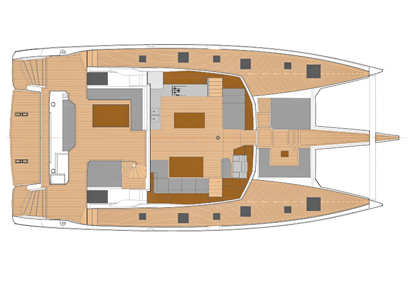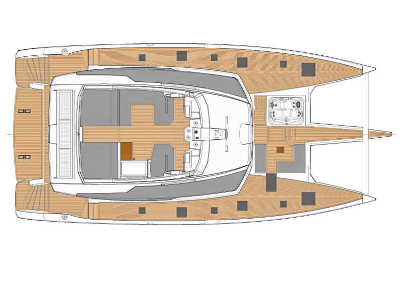 The beautiful forward area is a clear example of this concept. Here, a jacuzzi and a cozy dinette are positioned below the deck level. The result is a space that, whilst it doesn’t sacrifice the forward view when sailing, gives moments of precious privacy both in port and at anchor.