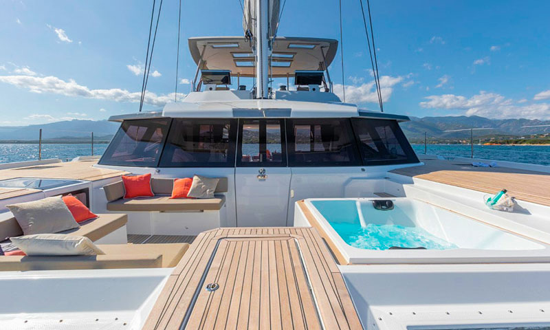 When I get the bow, I even have to rub my eyes to believe what I see: a jacuzzi, perfect to accommodate two people, is integrated into the cockpit. I had never seen one on a sailboat of this size, not even on a catamaran.