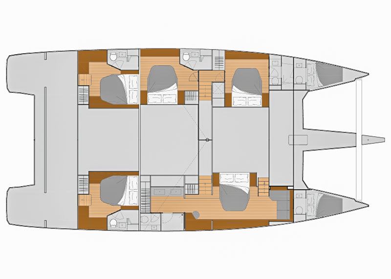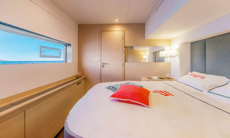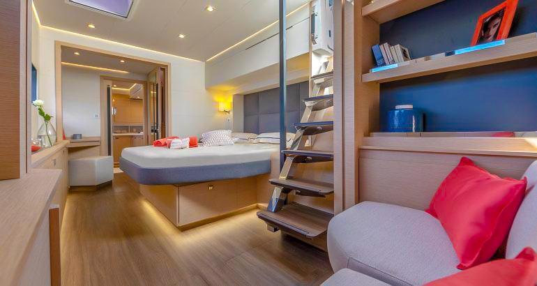 In the version we have tested, the master cabin and its huge bathroom take up the whole central section of the starboard hull. Just to give you a term of reference, suffice to say that the same section on the port hull accommodates two double cabins, both of excellent dimensions and equipped with en-suite bathroom.