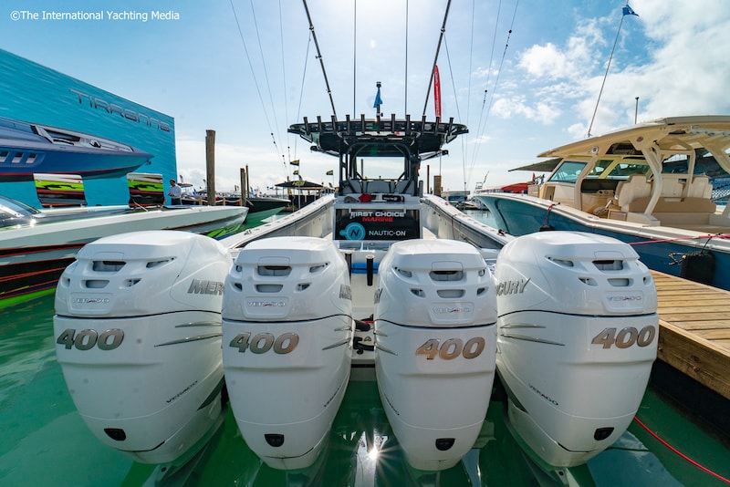 days since the brand-new Mercury Verado 400 were presented and, as usual for Mercury, the outboards are already available for testing. After all, you only have to walk down the jetties of the Miami Boat Show to realize that; they are present very widely, in their colourful guises, to adorn the sterns of the boat exhibited.