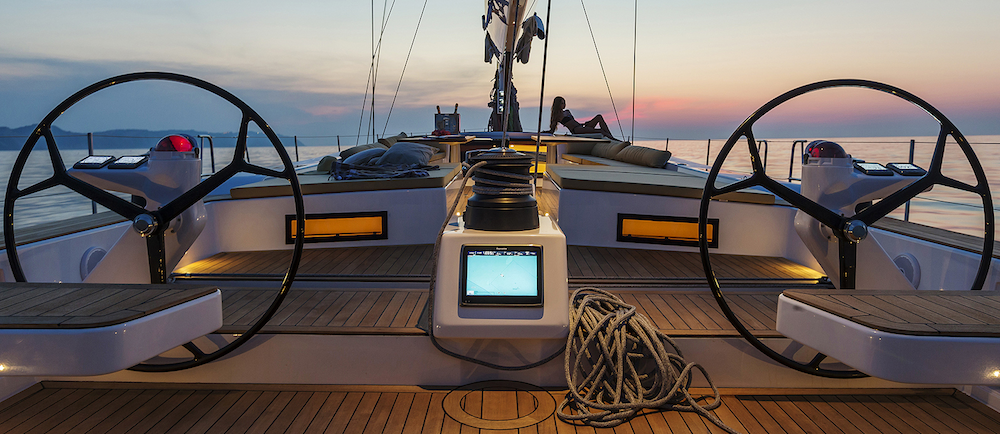 Now that all handlings are completed, we can relax and we quietly admire one of the clearest decks we’ve never seen. The cockpit is huge, an expanse of teak interrupted only by a step which ideally divides the rigging zone from the relaxation one.