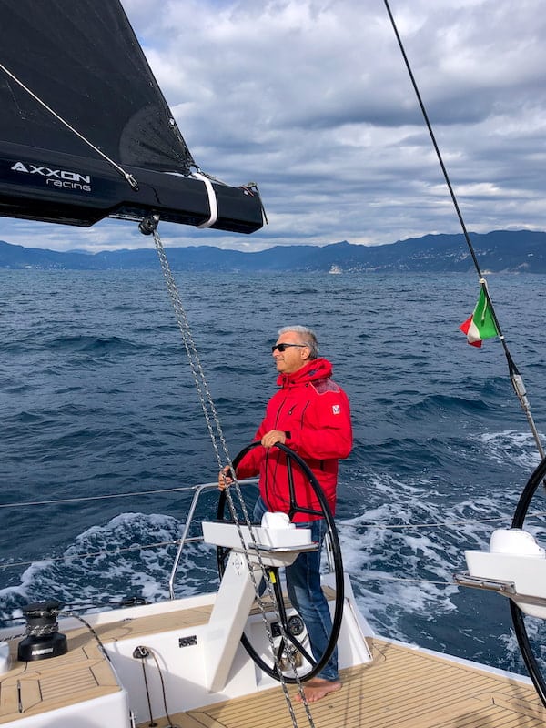 The crew is all positioned in the stern half of the boat, no one touches a sheet, I steer from windward with incredible ease, the wheel delivers millimeter precision.