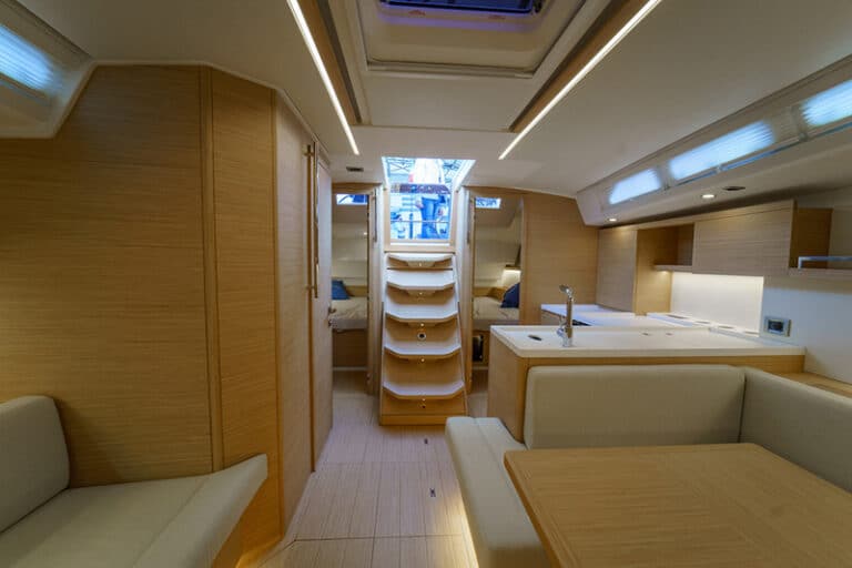 The L-shaped galley on the left is fully-equipped. Amidships, there are a dinette with a U-shaped sofa and a table for 8 guests while, on the starboard side, there are an additional sofa and a chart table, positioned against the bow bulwark.