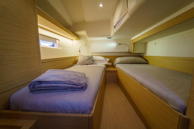 The sleeping zone also includes two other double-bedded cabins which share the same head, equally equipped with separate shower box like on a pure cruiser.