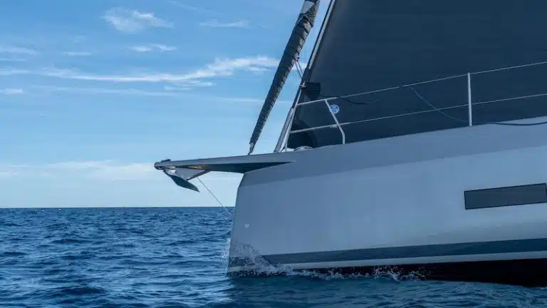 I suggest starting with the absolutely modern design, gorgeous in the chrome colours of the glass-carbon hull, with an inverted bow (scimitar-shaped) with a 1.3 metre long carbon bowsprit, which leaves room for water lines and appendages characterized by a variable draft, from 2.30 to 3.80 metres.
